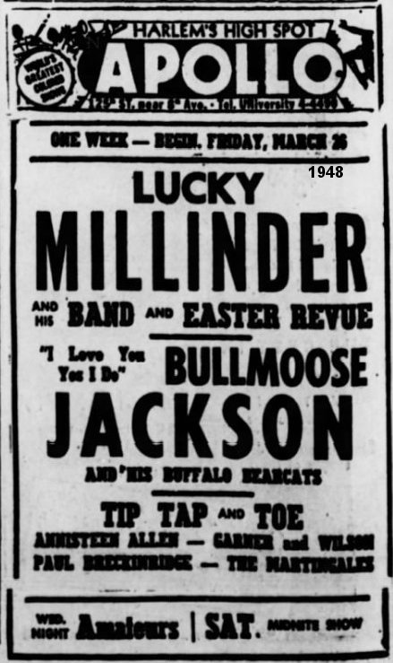 The April 20 New York Age said: "Next week Lucky's band will once again provide a delightful assortment of jump tunes and symphonic numbers in swing tempo. Annasteen [sic] Allen and Buell Thomas [who'd replaced Leon Ketchum] are the vocalists with Lucky's band. Miss Allen has been with him for some time and sang on some of his most successful recordings. Buell Thomas is a newcomer. Advance reports indicate that he is an unusually fine tenor and that he will give Apollo Theatre goers a thrill." The only problem is that Millinder wasn't at the Apollo the following week (nor at any future time in all of 1946). I have no explanation.