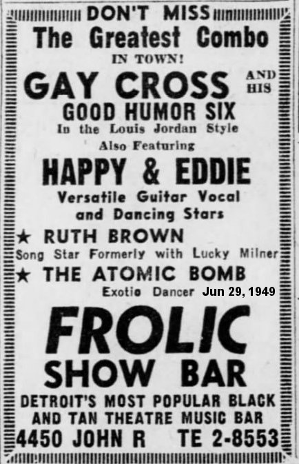 On October 29, Lucky was back at the Paradise Theater in Detroit, this time along with the Rimmer Sisters, Miller & Lee, and Lockjaw Jackson. I don't know when the following happened, but it was probably at this time. Millinder was at the Paradise and an unknown singer named Ruth Brown was at the Frolic Show Bar. Lucky heard Ruth and offered her a job with his band, although there wasn't really a place for her. But he took her along so she could observe and learn arrangements. (Ruth later credited Annisteen as being like a mother to her during this time.) For a month, Ruth observed and learned (but didn't sing). Then, the band appeared at Turner's Arena (Washington, DC) and it was Ruth's big break. She sang "Evil Gal Blues" and "Tomorrow Night", getting a good reception from the crowd. But then, offstage, one of the musicians asked her to get them some sodas. She did. Millinder saw it, and fired her on the spot, saying that he'd hired a singer, not a waitress. She was now stranded in Washington, with no back pay. (Fortunately, Blanche Calloway, manager of the nearby Crystal Caverns, gave her a job that paid her enough to get back home.) By June of the following year, when Ruth Brown again appeared at the Frolic Show Bar, she was advertised as "Song Star Formerly with Lucky Milner [sic]".