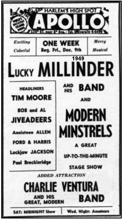 Millinder was back at the Apollo the week of December 9, 1949, with a stage show called "Modern Minstrels". Others named in the ad were Tim Moore, Bob & Al (the Jivadeers), Ford & Harris, Lockjaw Jackson, Paul Breckenridge, and the Charlie Ventura Band.