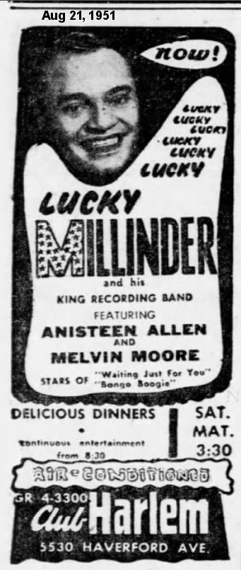 In August 1951, "Lucky Millinder and his King Recording Band" were at the Club Harlem in Philadelphia.