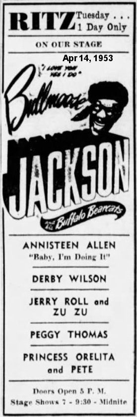 In March 1950, Annisteen was part of a Millinder tour that also included Big John Greer and Wynonie Harris. During this time, she played the Howard (Washington, DC), the Royal (Baltimore), and the Regal (Chicago). Wynonie had been Millinder's vocalist from April 1944 to September 1945; when he left, his vocal slot was taken over by Bull Moose Jackson.