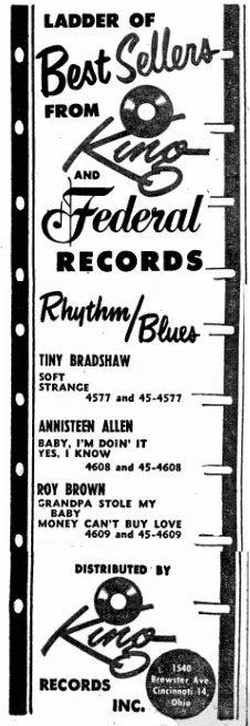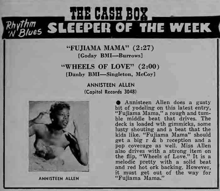 Fortunately, the August 12 Cash Box was there to save the day: "'Hot' is the word for this offering called 'She Lost Her Re Bop.' Lots of voices join in to lift it into the hit class but that of Annisteen Allen is the one we liked best. She's really good and gets lots of help from Bull Moose Jackson to real advantage. Were it not for the fact that this tune is out of the 'Hey! Ba-Ba-Re-Bop' family, this platter might cause a sensation. As it is, it's still top juke box fare, with lots of rhythm, lots of stomp, lots of flash. And the flip, 'Give It Up' is just as good. If you have any boxes in Harlem-type locations, give this platter a listening."