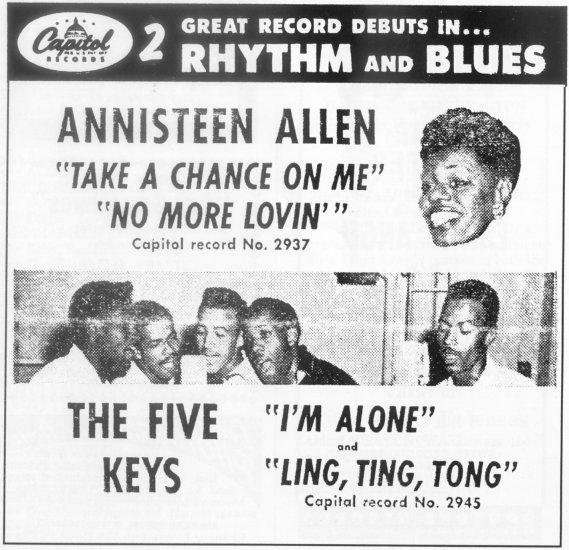 To complicate my life, the New York Age of January 29, 1949 had an article titled "Anisteen [sic] Allen Now With Decca". It called her "former girl vocalist featured with the Lucky Millinder orchestra", said she'd "direct her own all-star instrumental group", and had signed a "Millinder management contract". Her first releases would be "due in early spring". I have no idea what that was all about, since she continued to appear with Lucky, continued to record with him, and had no Decca recordings until signing with them again in 1956.