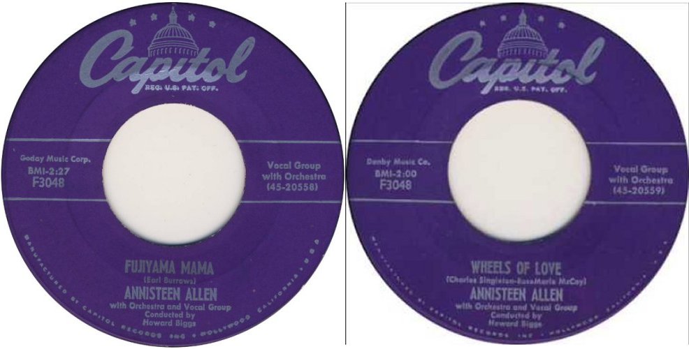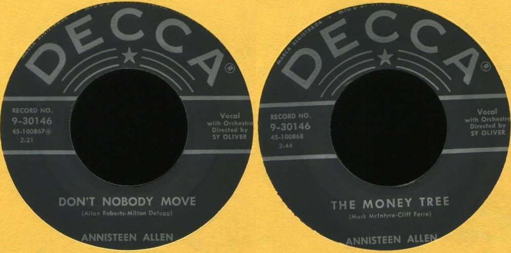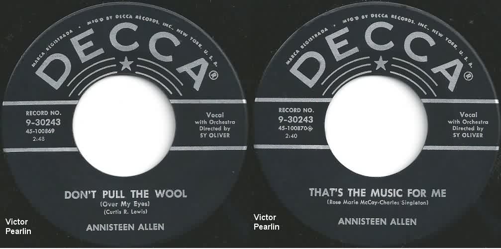 Of course, Cash Box (December 14) had to take an opposing view, giving "That's The Music For Me" a B+ ("Annisteen Allen goes cornball on this side and comes up with a contagious rhythm item reminiscent of the music of the good old days. Catchy side jockeys should go for in a big way.") "Don't Pull The Wool" got a B: ("A clever new novelty with a pleasant lilt and a smart lyric, is handled with finesse by the polished songbird. Good coupling."