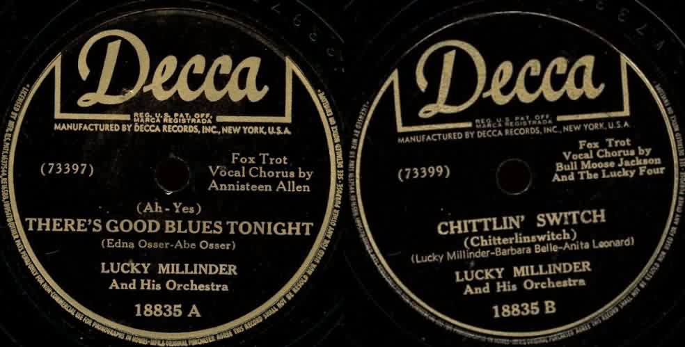 In April, Decca released "(Ah-Yes) There's Good Blues Tonight" / "Chittlin' Switch" (vocal by Bull Moose Jackson & the Lucky Four). All Decca releases were credited to Lucky Millinder & His Orchestra, with the vocalists also mentioned on the label.