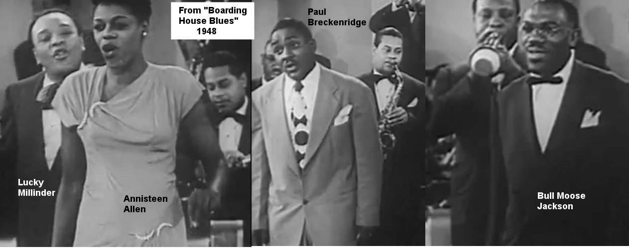 Somewhere along the way, the Millinder Orchestra had filmed some performances for the All American News movie "Boarding House Blues". Filmed in New York, it was released in September 1948. "Anistine Allen" (as she appeared in the credits) sang "Let It Roll", Paul Breckenridge sang "Sweet Slumber", and Bull Moose Jackson warbled "I Love You, Yes I Do". The September 4, New York Age was all over it; the first sentence read: "Dynamaestro Lucky Millinder's new starring film, 'Boarding House Blues', a full length feature production, will be released nationally in early September, for screening in a majority of America's movie houses." Good try, guys, but Millinder doesn't appear until an hour and five minutes into the film and I'm sure that it was shown mostly in theaters that had large black audiences. The band begins with a rousing instrumental number, fittingly called "Boarding House Blues" (written by Henry Glover), followed by Breckenridge, Allen, and Jackson, and then the band again, closing with "The Hucklebuck".