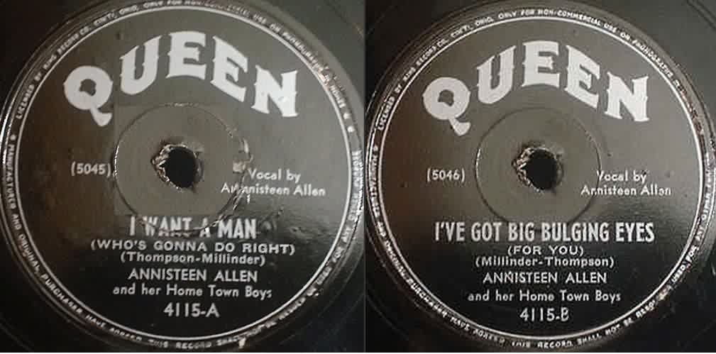 Also in April, Queen issued "I Want A Man (Who's Gonna Do Right)" / "I've Got Big Bulgin' Eyes (For You)". All Queen releases (other than "Oo-Oo-Ee Bob A Lee Bob") were credited to Annisteen Allen & Her Home Town Boys.