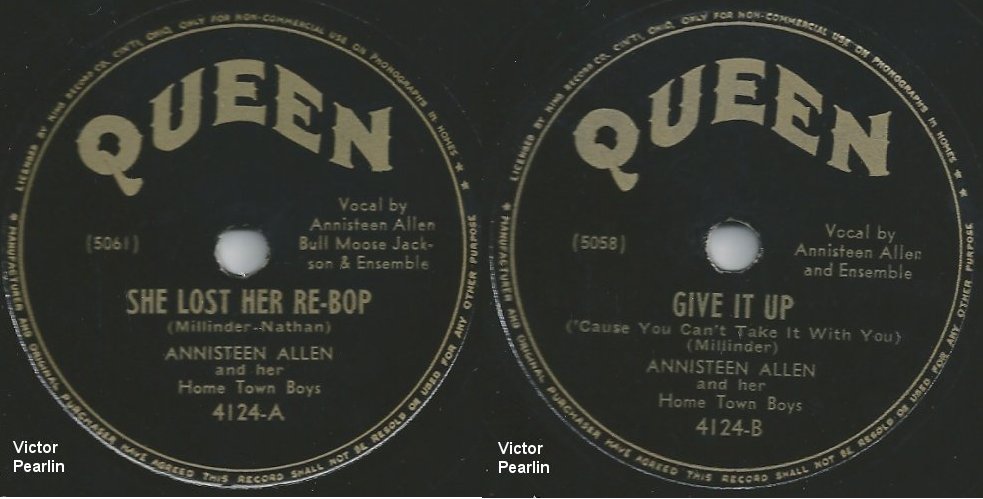 The next Queen release by Annisteen Allen & Her Home Town Boys was in July 1946: "She Lost Her Re-Bop", backed with "Give It Up ('Cause You Can't Take It With You)". The disc got a lukewarm review in the August 10 Billboard: "Top side ["Re-Bop"] is a jive ditty, with vouty lyrics on Hey Baba Leba vein. Be-bop wordage is not intended to make sense. Musical portions aren't good music, but they do have a certain amount of rhythmic drive. Give It Up has lyrics open to interpretation and as a result is not recommended for radio. Annisteen Allen shouts both sides, assisted by Bull Moose Jackson and vocal ensemble. Race locations may take to the jitterbug beat of this brace of sides."