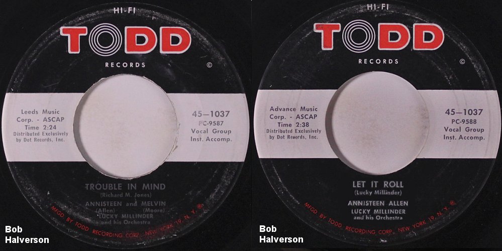 The first was on Paul Cohen's Todd Records (distributed by Dot). She got back with Lucky Millinder and Melvin Moore to record "Trouble In Mind" (as Annisteen & Melvin). The flip, just by her, was an updated version of "Let It Roll". Both sides got good reviews in Billboard and Cash Box, with "Trouble In Mind" being the preferred track.