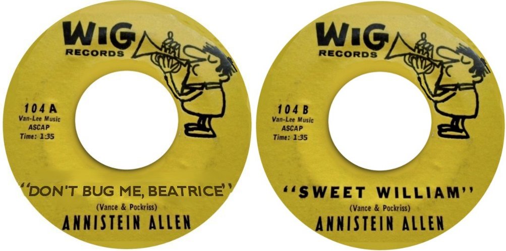 The other October 1959 entry was on a tiny New York label called Wig: "Don't Bug Me, Beatrice", backed with "Sweet William". Unfortunately, they misspelled her name on the label as "Annistein Allen". The trade paper reviews were essentially the same as for the Todd release, with "Don't Bug Me, Beatrice" getting the better press. It sounds like a recording I'd like, but I've never heard it. Billboard said: "The cat gets home at 3 a.m. and faces the wrath of his frau. Then he warns her, 'Don't bug me, Beatrice.' In the end he turns a machine gun on Beatrice and finishes her off." Since her (misspelled) name is the only one on the label, I don't know who the "meek-sounding voice" (as Cash Box put it) belongs to; I suppose it could be Melvin Moore.