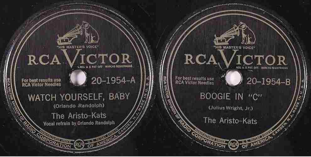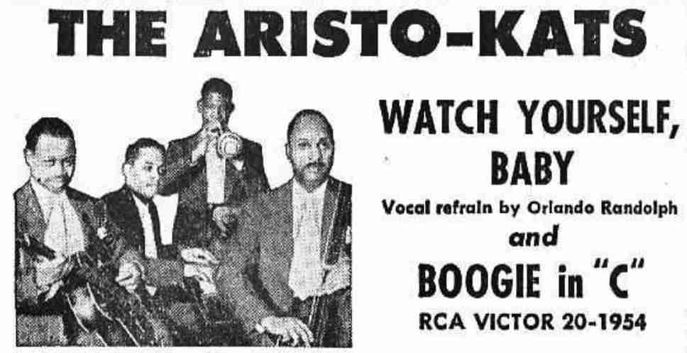 A new unit, these Aristo-Kats have plenty to offer for the needlers [those who play phonograph records]. A combination of piano, electric guitar, trumpet and bass, these "kats" really kick out with a lifto beat and loaded with musical meat for their solo flashes. [I swear: that sentence was copied correctly.] Orlando Randolph lends his husky Harlemese chanting for his own "Watch Yourself, Baby," with the instrumentalists whipping it out at an eight-beat speed tempo for "Boogie In 'C'." Both sides a cinch to spin brightly at the race locations.