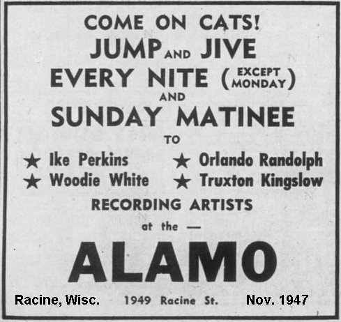 And that was pretty much the end of the Aristo-Kats. Again, because no one ever wrote about the Aristo-Kats at the time, we don't know why they broke up. By August 6, 1947, Orlando (as Marvin Randolph) was recording with Albert Ammons for Mercury. By November, he was with an unnamed group that played the Alamo, in Racine, Wisconsin. (The others were Ike Perkins, Truxton Kingslow, and Woodie White. Woodie White was a drummer who, during the war years, had been in a group called the Funky Five with Julius Wright. Orlando had previously worked with guitarist Ike Perkins in the Red Saunders aggregation in the late 1930s. Pianist Truxton Kingslow would end up in the Dozier Boys for a while in the mid-1950s.)