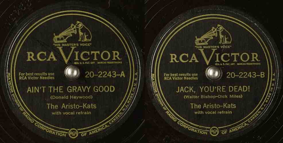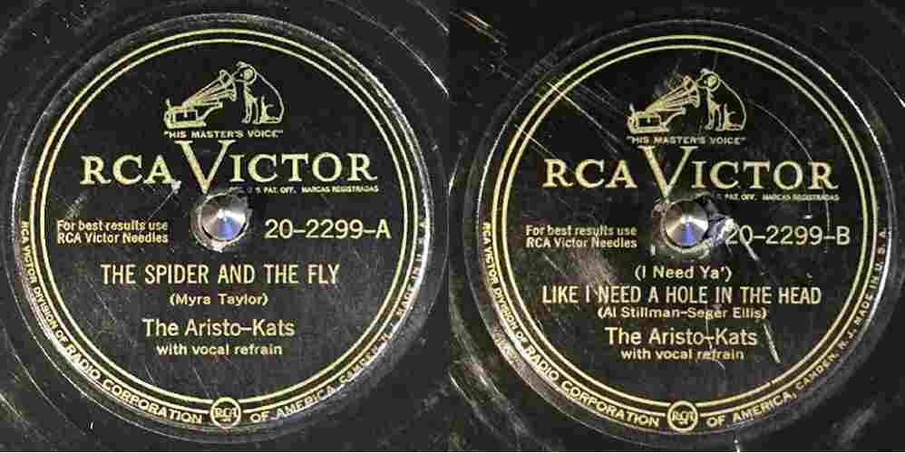 In spite of the conflicting reviews, RCA had them back for another session on February 17, 1947. Since, according to the RCA files, it was held in Hollywood, they must have been appearing there, but there were no ads or mentions in the press. The four songs recorded were: Jack, You're Dead! (probably led by the duet of Lefty Bates and Orlando Randolph), (I Need Ya') Like I Need A Hole In The Head (vocal by Lefty Bates), Ain't The Gravy Good (vocal by Orlando Randolph), and The Spider And The Fly (vocal by the full group). The March 22 Billboard was a bit behind the times: "The Aristo-Kats, cocktail foursome, cut four more sides for RCA Victor this week."