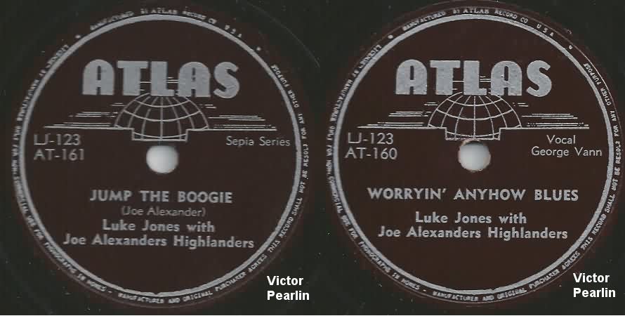 Her first Luke Jones session was held in mid-1946 (she wasn't on his first Atlas recordings, done earlier that year). The four songs were "Graveyard Blues", "Worryin´ Anyhow Blues", "Jump The Boogie", and "Shufflin´ Boogie". These were all released in the fall of 1946 as "Luke Jones, With Joe Alexander's Highlanders". The members were Luke Jones (alto sax), Betty Hall Jones (piano), Chuck Barksdale (bass), George Vann (drums and vocals; he'd been in the Spirits Of Rhythm), and an unknown guitarist.