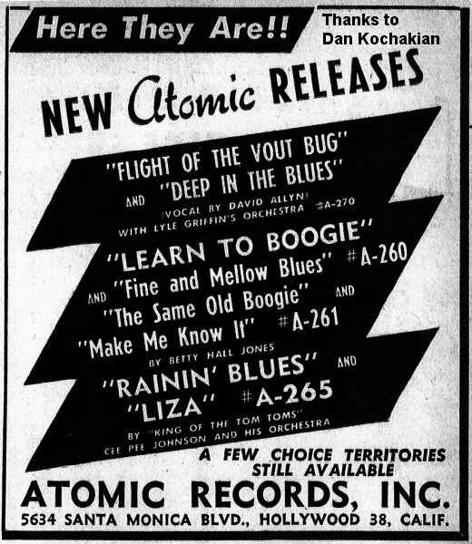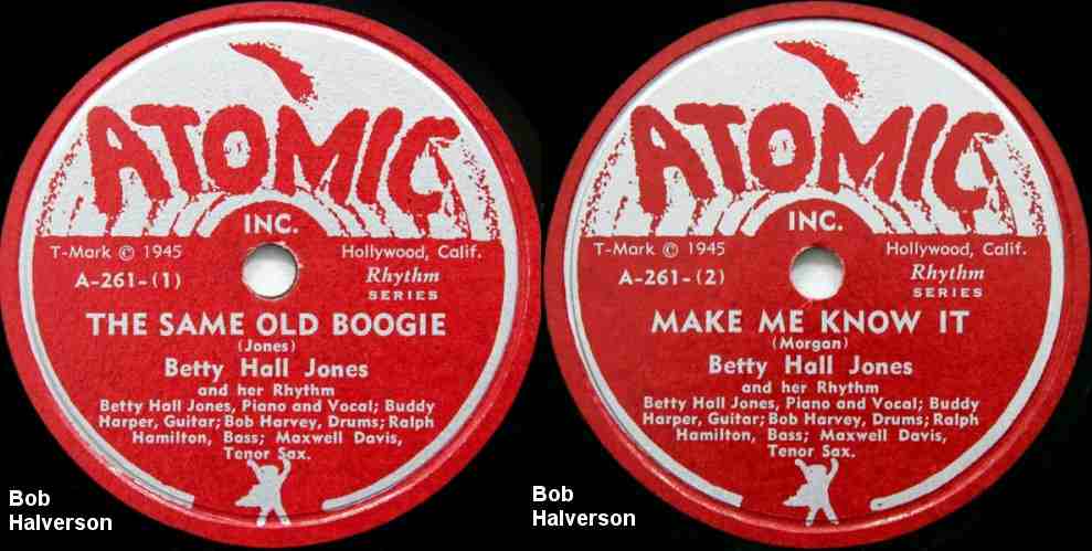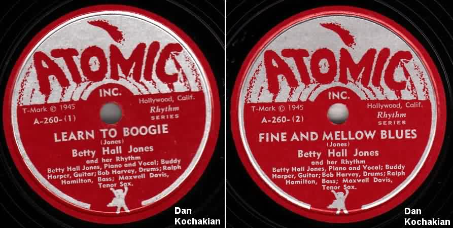 Probably in late 1946 (between Luke Jones sessions), Betty recorded some vocals for trombonist Lyle Griffin's Atomic label: "Learn To Boogie", "Fine And Mellow Blues", "The Same Old Boogie", and "Make Me Know It". These were all released, around January 1947, as "Betty Hall Jones & Her Rhythm" (Betty Hall Jones, piano and vocals; Buddy Harper, guitar (he'd been with her in Paul Howard's Quality Serenaders); Bob Harvey, drums; Ralph Hamilton, bass; and Maxwell Davis, tenor sax). Consistent with the strange industry practice, Atomic waited until the February 8, 1947 issue of Billboard to announce her signing. In spite of a fine crew of musicians, all four of her first outings were savaged by Billboard in their February 1, 1947 review: "there's little spark", "the same old stuff", "a yawn spurrer", and "colorless" were the terms they used.