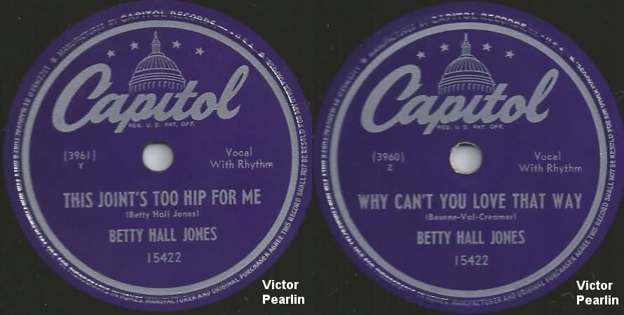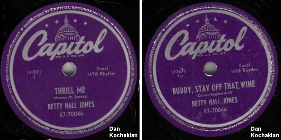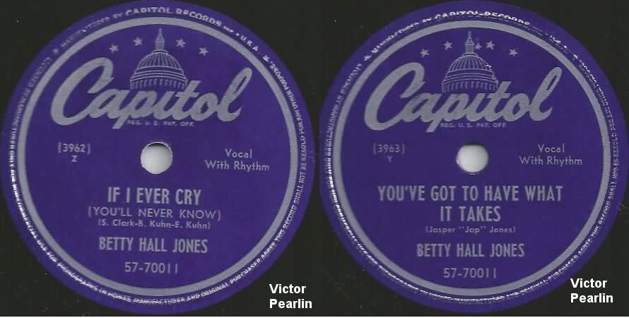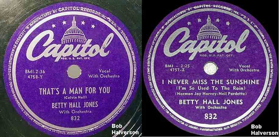 NOTE: There are tunes on Coronet and Coral, from 1952, usually attributed to Betty Hall Jones: "I Love You", "Honeymoon", "I'm Leaving You", and "Linda Brown". These are actually by Betsy Jones, singing with husband Sandy Sandiford's orchestra.