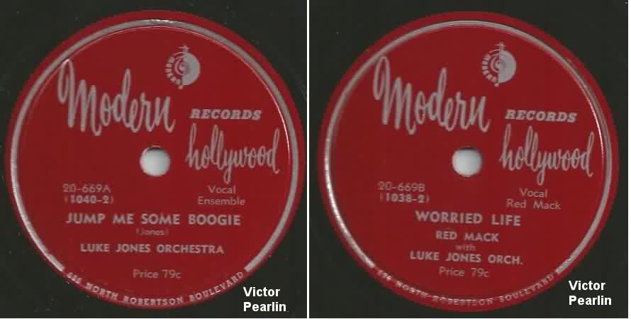 In mid-1949, she hooked up with Luke Jones again, playing piano on some recordings the "Luke Jones Orchestra" did for Modern. "Jump Me Some Boogie"/"Worried Life" were released around July 1949. Two others, "Mama, Oh Mama" and "Rompin' The Boogie" were subsequently issued, on Modern's RPM subsidiary, around September 1950.