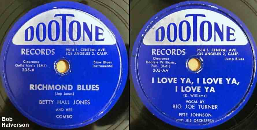 Betty's next stop was Dootsie Williams' Dootone Records, where she had a single side in January 1952: the instrumental "Richmond Blues" (written by Jap Jones to honor Richmond, Missouri, his home town). The side was credited to Betty Hall Jones & Her Combo, whoever they might have been. The flip side, Big Joe Turner's "I Love Ya, I Love Ya, I Love Ya", had originally been issued on Coast in late 1948. While I usually see the record attributed to "Joe Turner and Betty Hall Jones", in truth, neither had anything to do with the other's recording. "Richmond Blues" was rated a 53 by Billboard on February 9 ("lacks sufficient drive and spirit"). Joe Turner didn't fare all that better, only receiving a 61 - "starts off slowly and fails to pick up pace". (There's a possibility that Dootone reissued "I Love Ya, I Love Ya, I Love Ya" with Joe Turner's "Born To Gamble" as the flip. That was another old Coast master.)