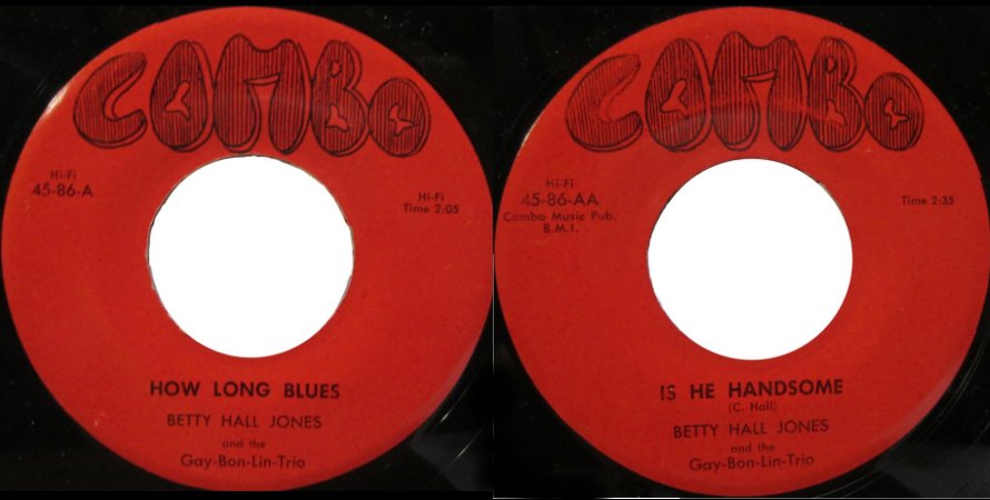 Betty seems to have done no recordings for three more years. Then, she turned up, once again, on Combo. Although the labels credit "Betty Hall Jones and the Gay-Bon-Lin Trio", Betty is only playing piano on them. The Gay-Bon-Lin Trio consisted of three sisters: Gay, Bonnie, and Linda Cowie, who seemed more obsessed with winning beauty contests than with being entertainers (Gay Cowie was Miss San Diego). I'm not sure what Betty's involvement was, other than playing the piano, so I don't really understand why she got top billing. The orchestration on "Is He Handsome" sounds too robust for the small musical groups she usually fronted, and is, presumably, a Dootsie Williams studio orchestra.