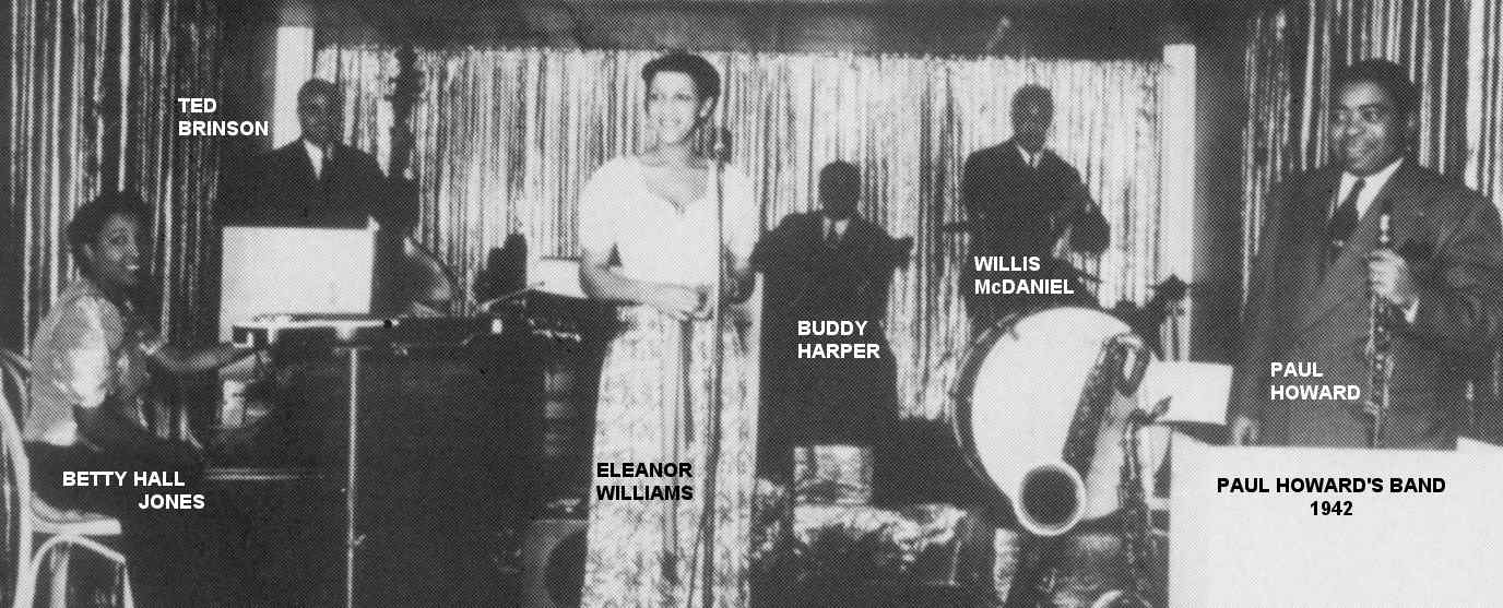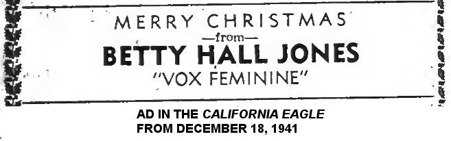 After the Solid Senders, she joined Paul Howard's Band. The December 27, 1941 California Eagle had a page with Christmas messages from local entertainers ("Holiday Greetings From The Theatrical World"). Represented were the 3 Chocolateers, Dusty Brooks & the 4 Tones, the 4 Blazes, Cee Pee Johnson, Dootsie Williams & His 4 Chocolates, Alton Redd, the 3 Shades, Leroy "Snake" Whyte & His Orchestra, Leon Rene, Eddie Beal & His Trio, T-Bone Walker, and Sam Franklin & His California Rhythm Rascals (a group that included Jasper "Jap" Jones on trombone and Joe Liggins on piano). More to the point, there was a greeting from Betty Hall Jones ("vox feminine") and another from Paul "Ox Blood" Howard & His Quality Serenaders, who were named as: Betty Hall Jones (piano/arranger), E.J. "Buddy" Harper (guitar), Edward Hale (alto sax/vocalist), Ted Brinson (bass/steel guitar; he'd go on to have the Los Angeles garage studio where "Earth Angel" was recorded), and Willis McDaniel (drums); Paul Howard himself played the saxophone, clarinet, oboe, cornet, bassoon, flute, and piano. (The Quality Serenaders had been around for a long time and, back in 1929, had a drummer named Lionel Hampton; you may have heard of him.)