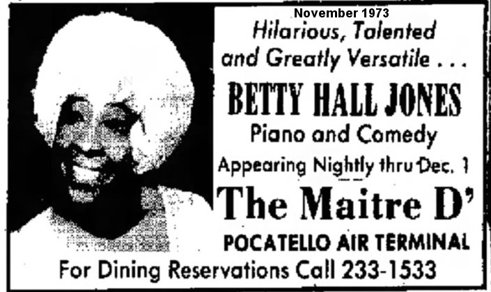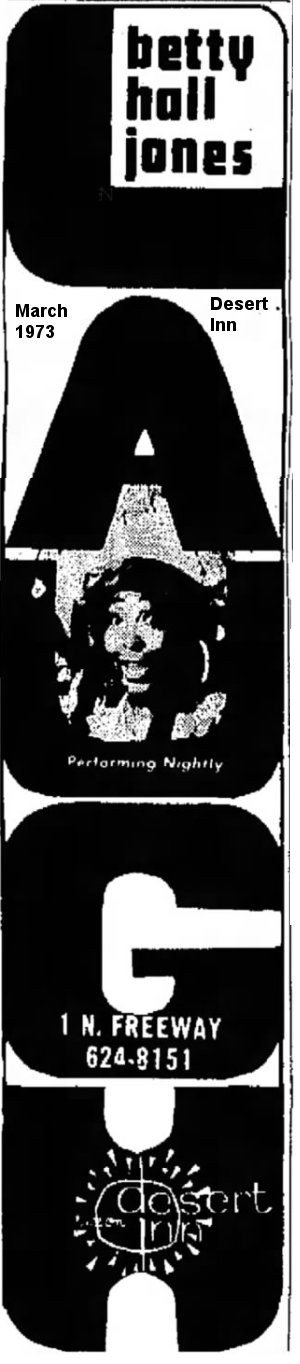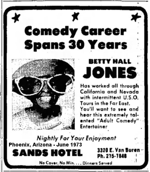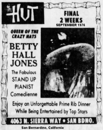 In the 1970s, Betty was still going strong: October 1971 at the Claremont Hotel, in Eastbay, Nevada; March 1973 at the Desert Inn, in Tucson, Arizona; June 1973 at the Sands Hotel in Phoenix Arizona; November 1973 at the Maitre D', in Pocatello, Idaho ("she plays piano and dishes out risqué comedy"); March 1974 at the Stardust Galaxie Room, in Yuma, Arizona; September 1976 at The Hut, in San Bernardino, California.