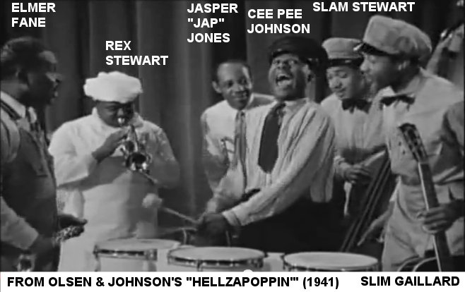 On June 11, 1941, Betty Hall (as Elizabeth B. Hall) married trombonist Jasper "Jap" Jones, who'd once been with the Oklahoma City Blue Devils, along with Lester Young (I was able to find the California marriage record). Another milestone, in December 1941, was the release of the Olsen & Johnson movie, "Hellzapoppin'". Jap Jones appears as the trombonist in the frenetic instrumental/dance sequence (featuring Slim & Slam, Cee Pee Johnson, and the Harlem Congeroos [actually Whitey's Lindy Hoppers]).
