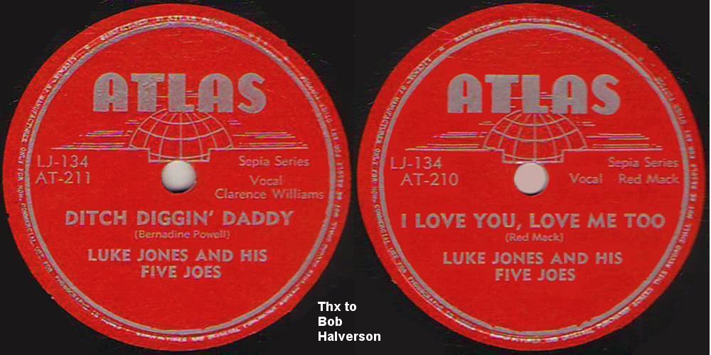 An early 1947 Luke Jones session gave us "I Love You, Love Me Too", "Ditch Diggin´ Daddy", "She´s My Baby", and "Midnight Blues". This time, the members were: Luke Jones (alto sax), Betty Hall Jones (piano), Chuck Barksdale (bass), George Vann (drums), McLure "Red Mack" Morris (trumpet and vocals), and Clarence Williams (vocals). These were all released, in early 1947, as by "Luke Jones & His 5 Joes". Vocals on all were by Clarence Williams, except for "I Love You, Love Me Too", which was sung by Red Mack.