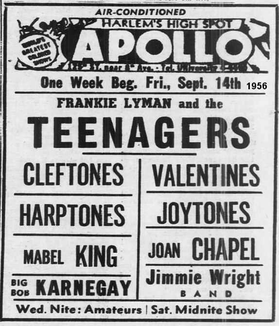 I assume he sang those songs when he appeared at the Apollo Theater on September 14, 1956. He shared the stage with the Teenagers, the Cleftones, the Valentines, the Harptones, the Joytones, Mabel King, the Jimmy Wright Orchestra, and Jean Chapel [misspelled "Joan" in the ad]. Speaking of... Bob was in the ad as "Big Bob Karnegay". Considering that there were only two appearance ads for him ever, it's a shame they couldn't spell his name correctly. Note that all except Jean Chapel were Rama acts.