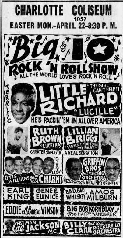 And now, for complete confusion: his second, and last, advertised appearance. He became part of the "Big 10 Rock 'N Roll Show", with Little Richard, Ruth Brown, Lillian Briggs, Otis Williams & the Charms, the Griffin Brothers, Earl King, Gene & Eunice, Amos Milburn, Eddie "Cleanhead" Vinson, Al "Fat Man" Jackson (as MC), and Billy Clark and His Rockerbilly Orchestra. It appeared at the Charlotte, North Carolina Coliseum on April 22, and was advertised for a week before. I have to imagine he did the phone routine, since he was billed as "The Happy Wanderer", but the April 23, Charlotte Observer only said: "Square-shouldered Bob Kornegay did well with 'Is It True', with what he termed a Baptist beat." That was the only review of a Kornegay performance ever printed.