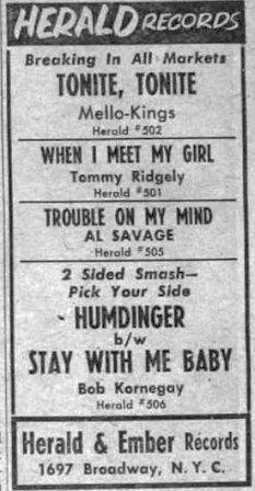 Bob's final Herald record, released in August 1957, was "Humdinger", backed with "Stay With Me Baby". Once again credited to "Big Bob Kornegay", they were reviewed in the September 7 Cash Box: