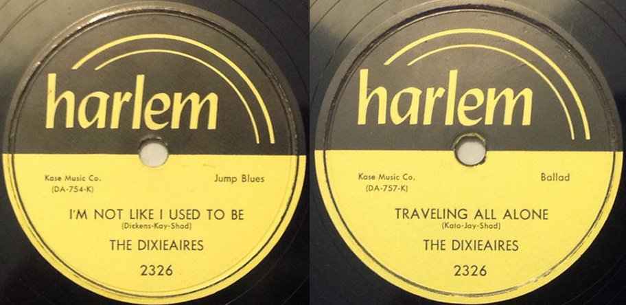 In mid-1954, Joe Van Loan, tenor lead of the Ravens on Mercury, got together with some friends of his and cut a record. These friends were J.C. Ginyard, Willie Ray, and Bob Kornegay, who just happened to be three-quarters of the Du-Droppers. (The fourth Du Dropper, Harvey Ray, wasn't on the session.) Using Ginyard's "Dixieaires" catch-all name, they cut a single record for Morty Shad's Harlem label, released in late 1954. Joe Van Loan leads on "Traveling All Alone" and Bob Kornegay is out front on "I'm Not Like I Used To Be".