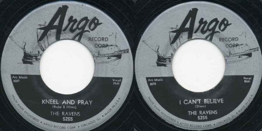 Around May 1956, in another complicated story, Joe Van Loan was the only member left in the Ravens. Needing a group to record for Argo, he called on some of the guys he'd been doing all that extra-curricular work with. So the same group that had recorded as the Bells, now became the "Ravens": Joe Van Loan, Willie Ray, Willis Sanders, and Bob Kornegay. On Argo, they released "Kneel And Pray", coupled with "I Can't Believe" (led by Kornegay) in July. They were reviewed in the August 8 Billboard: