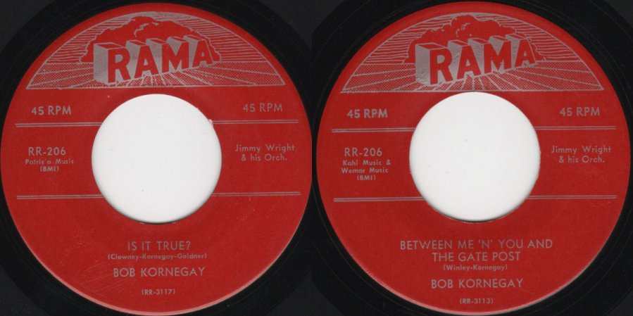 Around September, a Bob Kornegay record appeared on Rama: "Is It True?", backed with "Between Me 'N' You And The Gate Post", both written by Bob. An unreleased Rama side was "Stop Knocking Rock 'N' Roll". (Note that, when it found its way onto a Westside CD in 1999, he'd magically become "Bob Cornegie".)