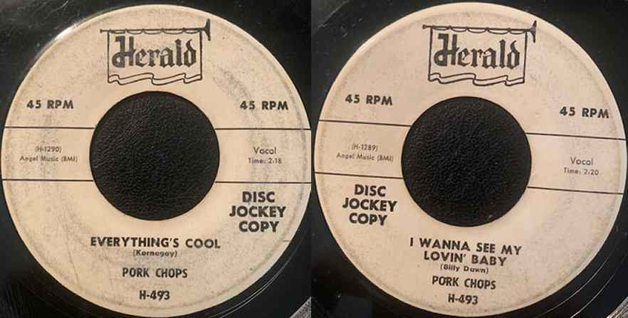 Another interesting record was "Everything's Cool", coupled with "I Wanna See My Lovin' Baby", recorded for Herald in October 1956 and released in December. The artist was "Pork Chops" and, since it wasn't a group record, that's the name the singer himself was using. Was it Bob Kornegay? I'm not sure. He wrote "Everything's Cool", so it might be, although it doesn't exactly sound like him to me (but never trust my ears).