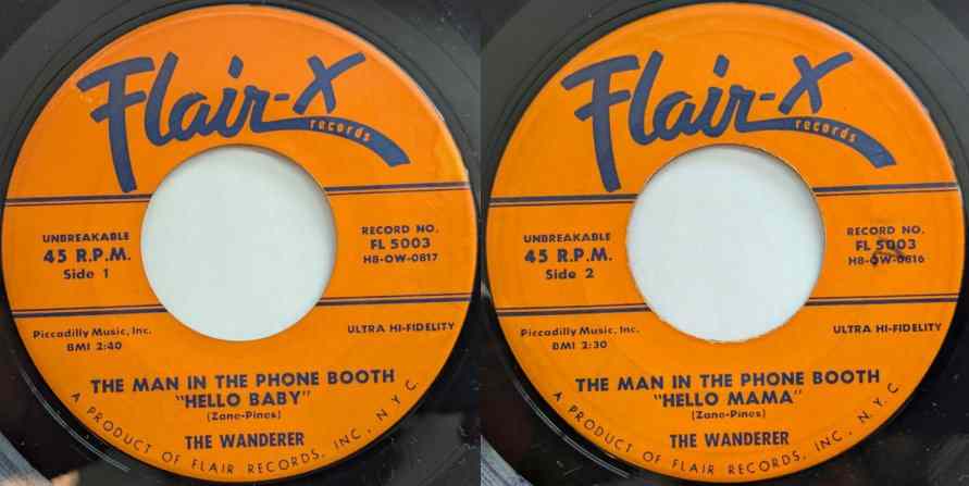 In late 1956, he recorded a song called "The Man In The Phone Booth". There were two variations, one subtitled "Hello Baby" and the other called "Hello Mama". However, he didn't record it for Herald, but for Kappy Jordan's Flair-X Records, which issued it in January 1957. To keep his identity secret, it was released as by "The Wanderer". Since he didn't write them himself, no one would ever know his true identity. Would they? (Note that the Flair-X cuts were also released on London Records in Canada, although the titles were slightly altered to "The Man In The Telephone Booth".)