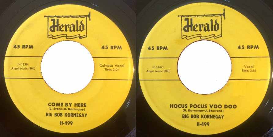 In spite of all the hype in the press, neither record became a hit. It didn't take Herald long to determine that, because in March, they issued "Come By Here", coupled with "Hocus Pocus Voo Doo", by "Big Bob Kornegay". They were reviewed in the April 13 editions of both Billboard and Cash Box: