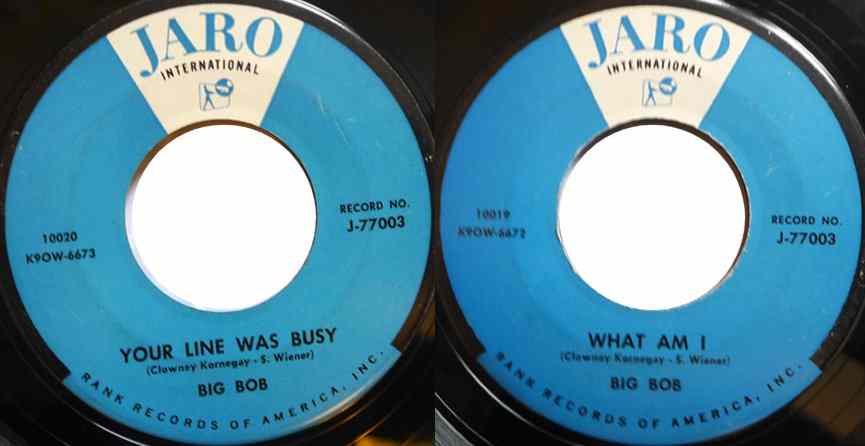A July 1959 entry was "Your Line Was Busy", backed with "What Am I", on the Jaro label, part of Top Rank Records. (They were released on Top Rank in the UK, Italy, and the Netherlands.) On these, both of which he'd written, he was billed as "Big Bob". They were reviewed in the August 10, 1959 Billboard, both receiving 3 stars.
