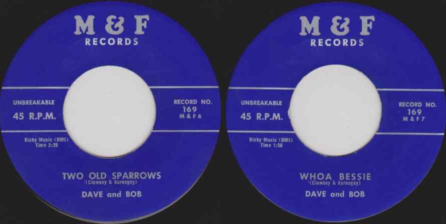 In early 1958, Bob teamed up with David Clowney, his songwriting partner, to record two of their compositions: "Two Old Sparrows" and "Whoa Bessie". They were released, as "Dave And Bob", on the M & F label, about which I can find out nothing.