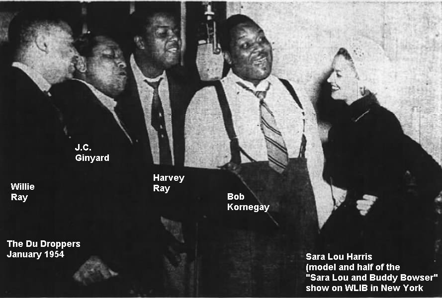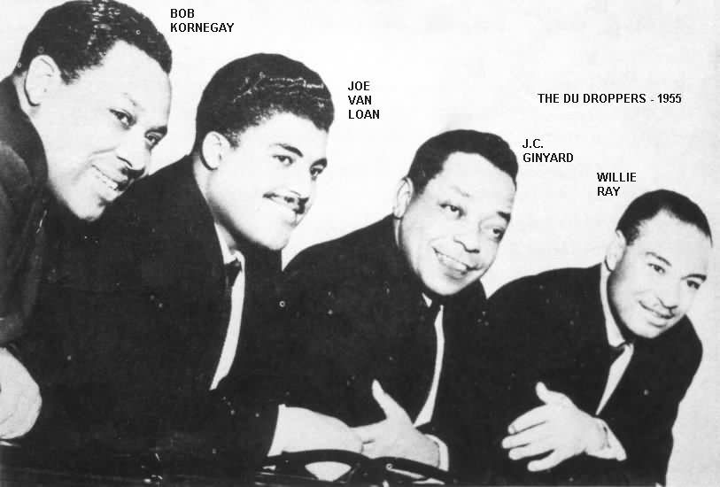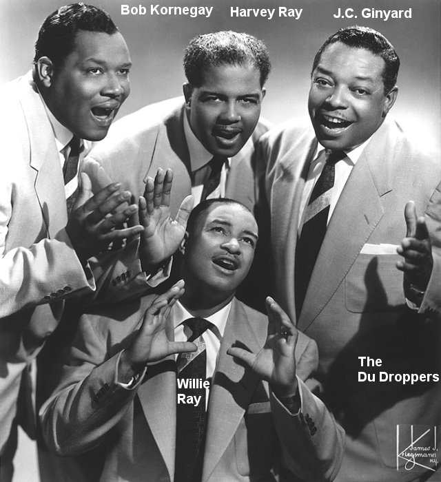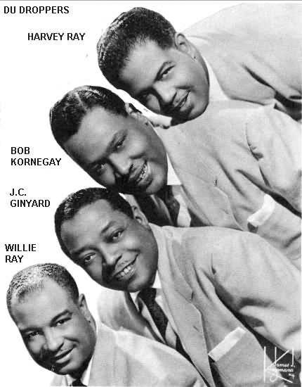 So they [the Ray brothers, Harvey and Willie] came down there and I heard them sing. I heard their voices and I said "Hey, how would you all like to organize another group?" ... They said "Well, we don't know too much about puttin' harmonies together and you had other groups..." I said "OK, I'll organize it, but I gotta find a bass singer." I knew a boy named Bob Kornegay. Well, Bob was singin' around in little bars and stuff like that with piano players and doin' his blues and so forth. I went over to Brooklyn and I found Bob and asked him to join the group. Around 1952 we organized the Du Droppers. [Note that he's left out original bass Eddie Harshaw, who was with them for a short enough period of time that Ginyard probably just forgot about him, even though he was Ginyard's friend. Also, nothing else said how Ginyard and Kornegay knew each other.]