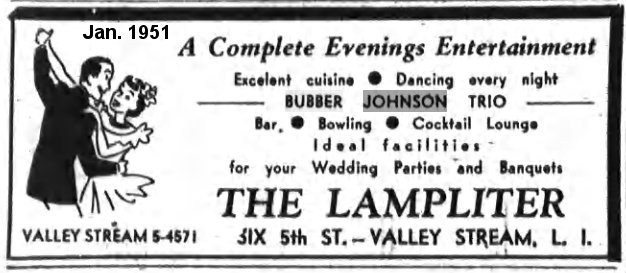 He only turns up once in 1950, when the August 8 Ohio Daily Express (Dayton) said: "'Bubber' Johnson, a riot of fun with his clever trio, is playing currently at 'The Lamplighter,' Rockaway Ave., at 57th street, Valley Stream, Long Island." Why an appearance in Valley Stream (right across the New York City border in Nassau County) is mentioned in a Dayton, Ohio paper is beyond me. However, it did introduce us to the Bubber Johnson Trio, which was still at the Lampliter (the correct spelling) in January 1951.