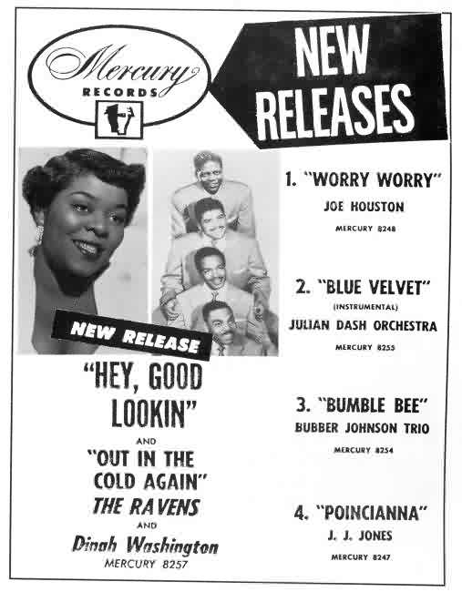 Digression: high tenor Joe Van Loan, currently a member of the Ravens (who were recording for Mercury), supposedly put together a group to back Wini Brown on some Mercury recordings. The songs ("Here In My Heart" "and "Your Happiness Is Mine") were credited to Wini Brown & Her Boyfriends. However, Van Loan's distinctive voice is completely missing from these, so is it really true or were they a group that Mercury itself threw together?.