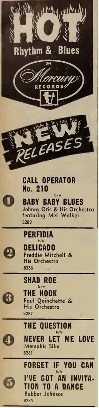 Drop Me A Line ("B+"): Johnson changes pace with a slow blues pretty. Tune has good pop possibilities. Voice has a bit of Nat Cole in it. [Many of Bubber's reviews will compare him to Cole.]