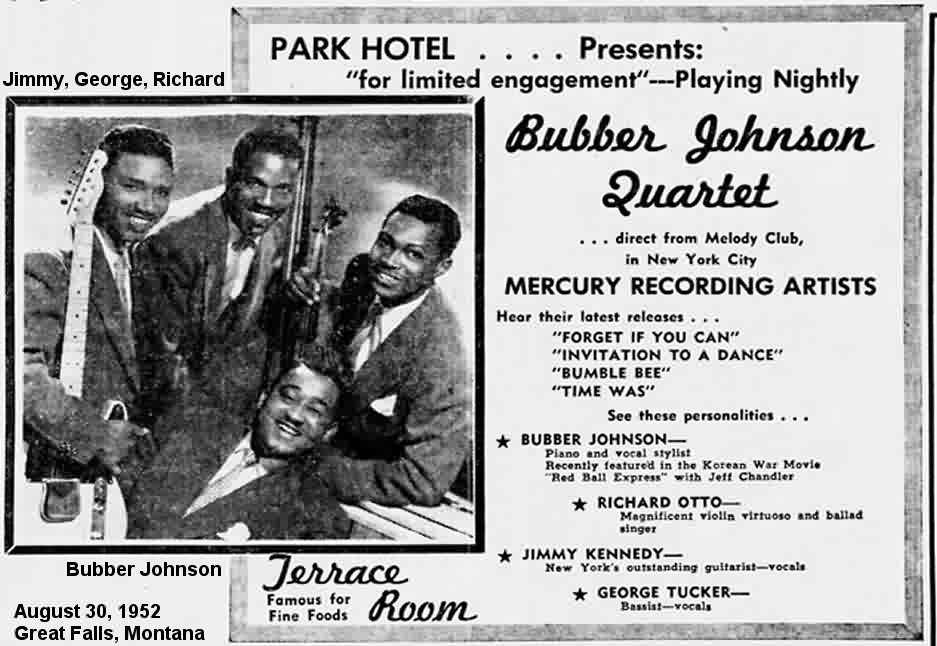 Finally, some names. An August 26, 1952 ad for the Terrace Room of the Park Hotel in Great Falls, Montana has a photo of the "Bubber Johnson Quartet" ("starting TONIGHT"), mentions all four of the Mercury titles, and actually names the members: