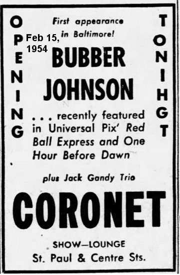 And that's the last we hear of Bubber for an entire year, until he turned up at the Coronet Lounge (Baltimore) in February 1954. The ad said: "recently featured in Universal Pix' Red Ball Express and One Hour Before Dawn". (However, the only movie called "One Hour Before Dawn" was a 1920 silent film.) The ad didn't mention "trio" or "orchestra"; from now on, he was on his own. [Richard Otto, by the way, would go on to team up with Sarah McLawler.]