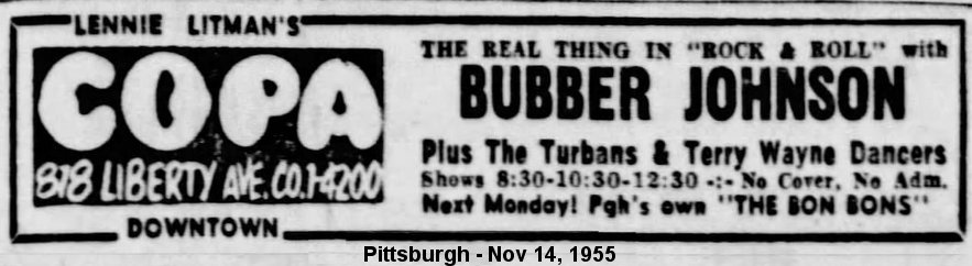 A double jolt of rhythm and blues will take over the Copa, opening Nov. 14, when Bubber Johnson, currently riding high on his "Q" label [???] waxing of "Come Home", and the Turbans, who have hit the best seller list with their Herald platter, "When We Dance," [why do they even bother?], open on a combined bill. It will be the first time the Copa has devoted a full show to rhythm and blues.