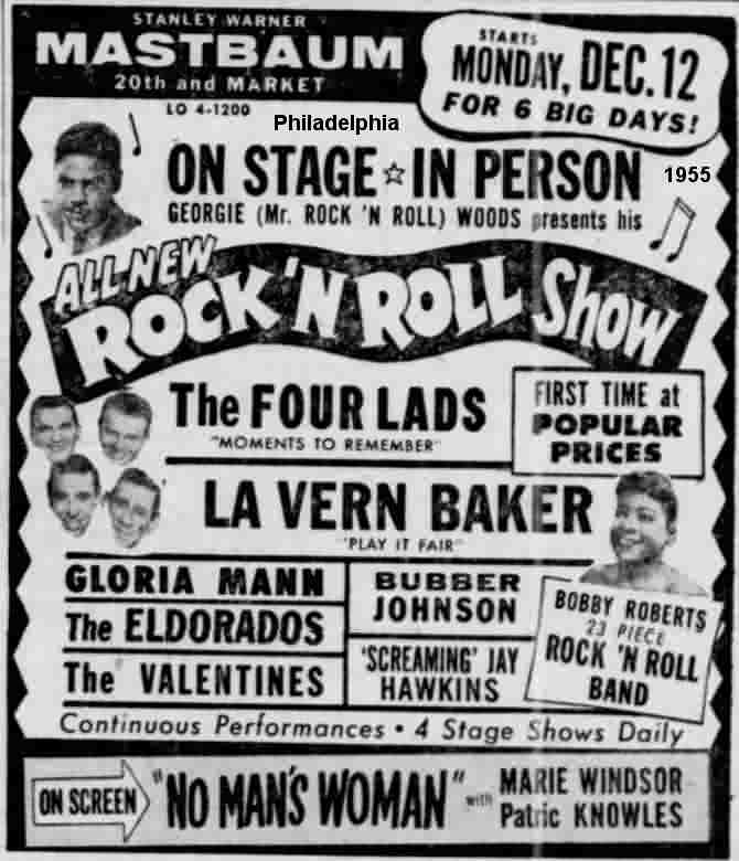 Right after that, Bubber traveled to Philadelphia for a big Rock 'N Roll show at the Mastbaum Theater the week of December 12, 1955. Others on the bill were Lavern Baker, the 4 Lads, the El Dorados, Gloria Mann, the Valentines, and Screamin' Jay Hawkins. The MC was DJ Georgie Woods.