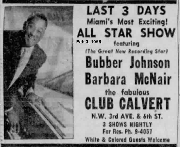 An ad in the February 3 Miami Herald announced that these were the last three days you could see Bubber and Barbara McNair at the Club Calvert. However, it was the only mention of him there; nothing said when he'd started.