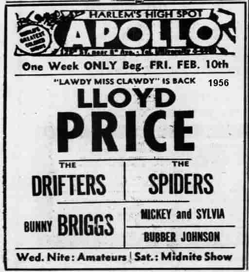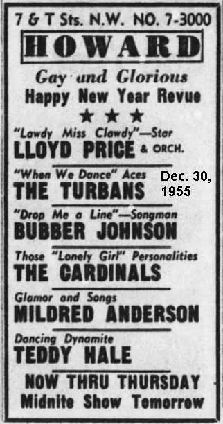 The week beginning December 30, 1955 found Bubber at Washington's Howard Theater, along with Lloyd Price, the Turbans, and the Cardinals.