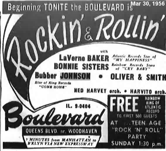 On March 30, he was part of the show at the Boulevard (Queens, New York), probably lasting a week. The Bonnie Sisters and Lavern Baker were also on the bill. The first 500 guests that showed up to the Sunday 1:30 PM performance had a choice of a free Rainbow, King, or Atlantic record.