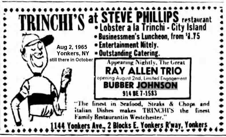 In late July 1965, Bubber was at Trinchi's in Yonkers, New York; he was still there in October.